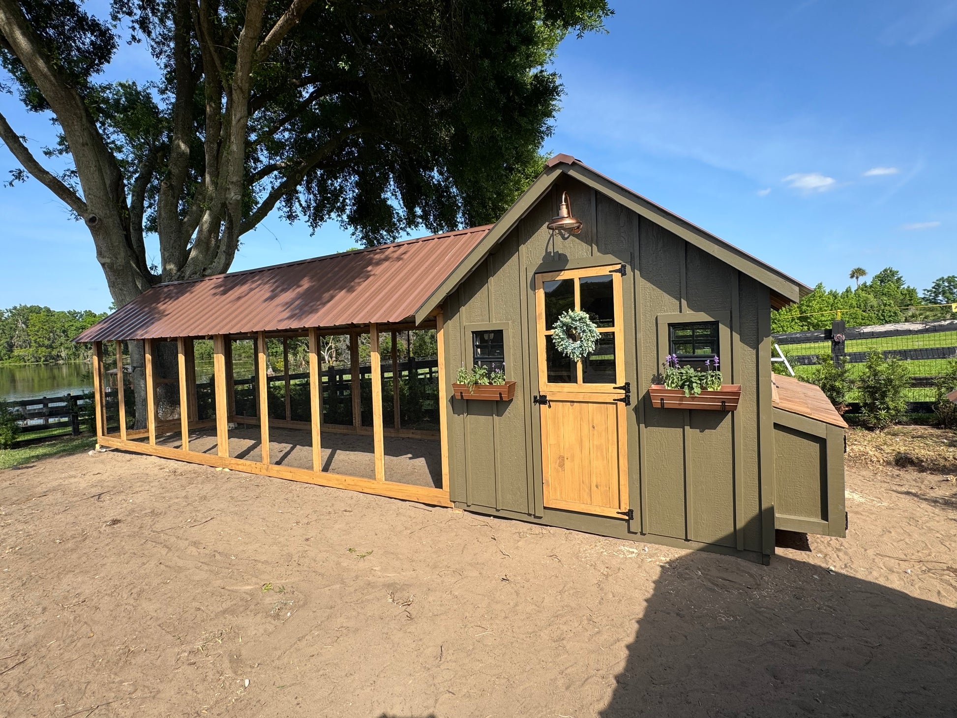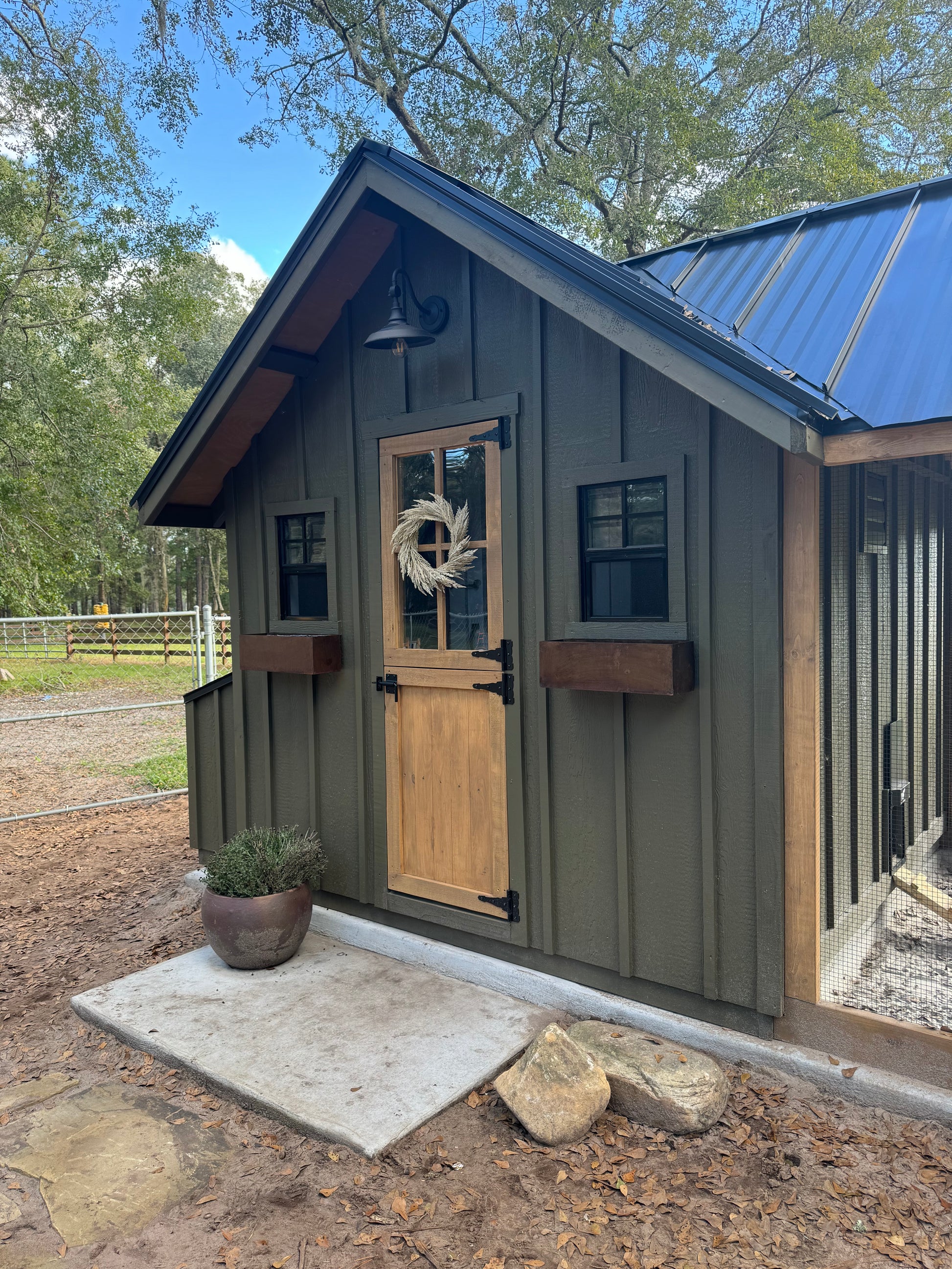 This coop includes an 8' X 8' Henhouse with an 8' X 18' Run. If you have the coop painted it will include the exterior and interior of the henhouse and run. This price does NOT include the wood sheathing under the metal roof that is an add on we can discuss separately. The coop will come with board and batten siding, the custom dutch doors created by us, metal roofing, and the storage egg hutch that is 18" x 7.5'