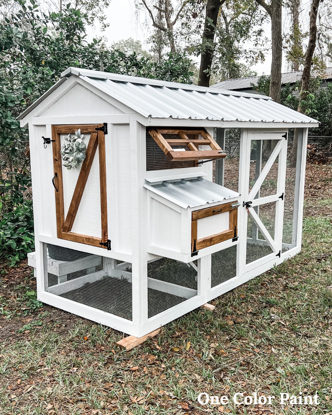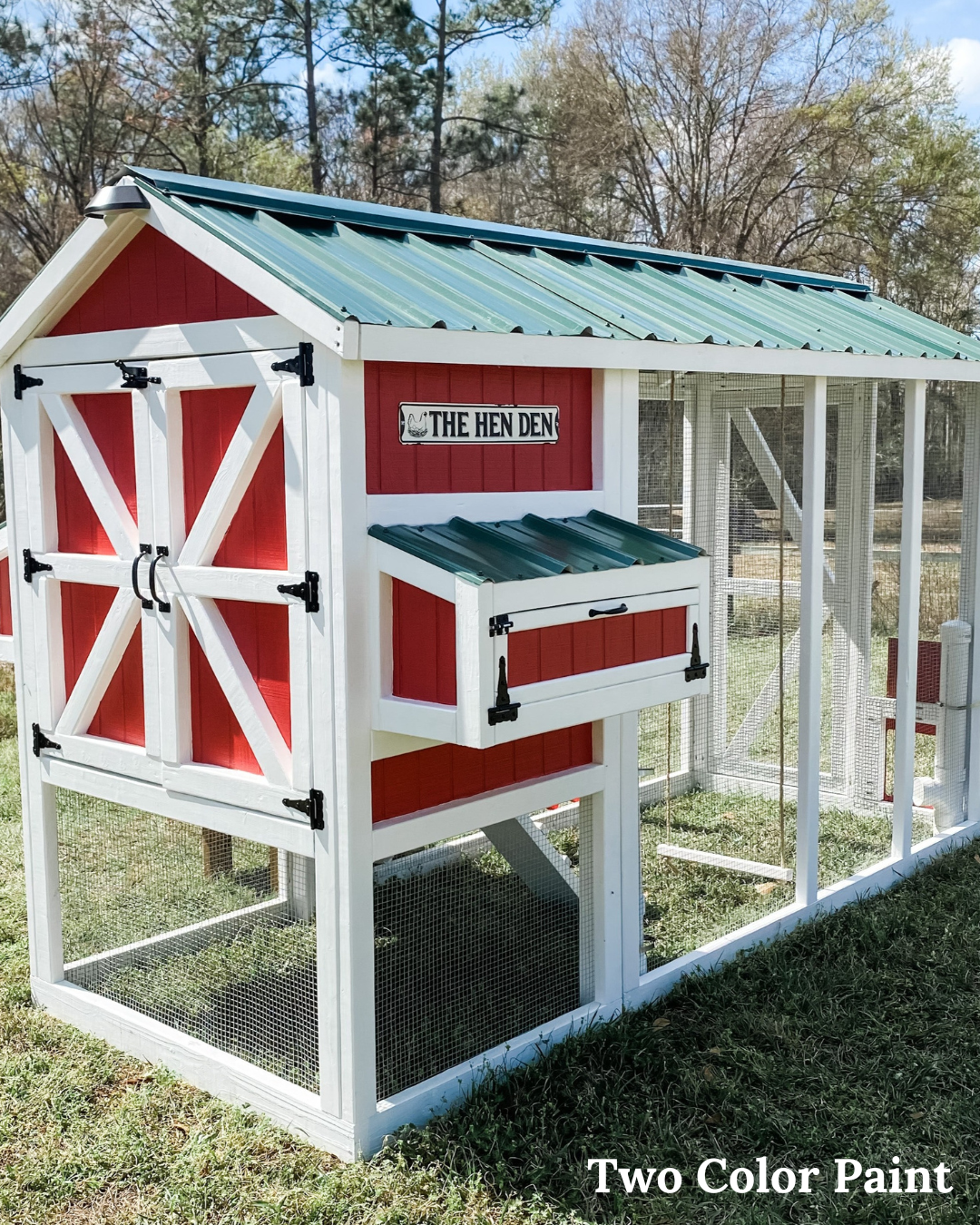 We only use the best materials to build our coops i.e. LP Smart Siding (50 yr), hand selected materials and Douglas Fir, 29 Gauge Galvalume Metal Roofing and rust resistant black hardware. We use a high quality exterior paint (Sherwin Williams) on all of our coops along with sealed, stained accents if you have them.