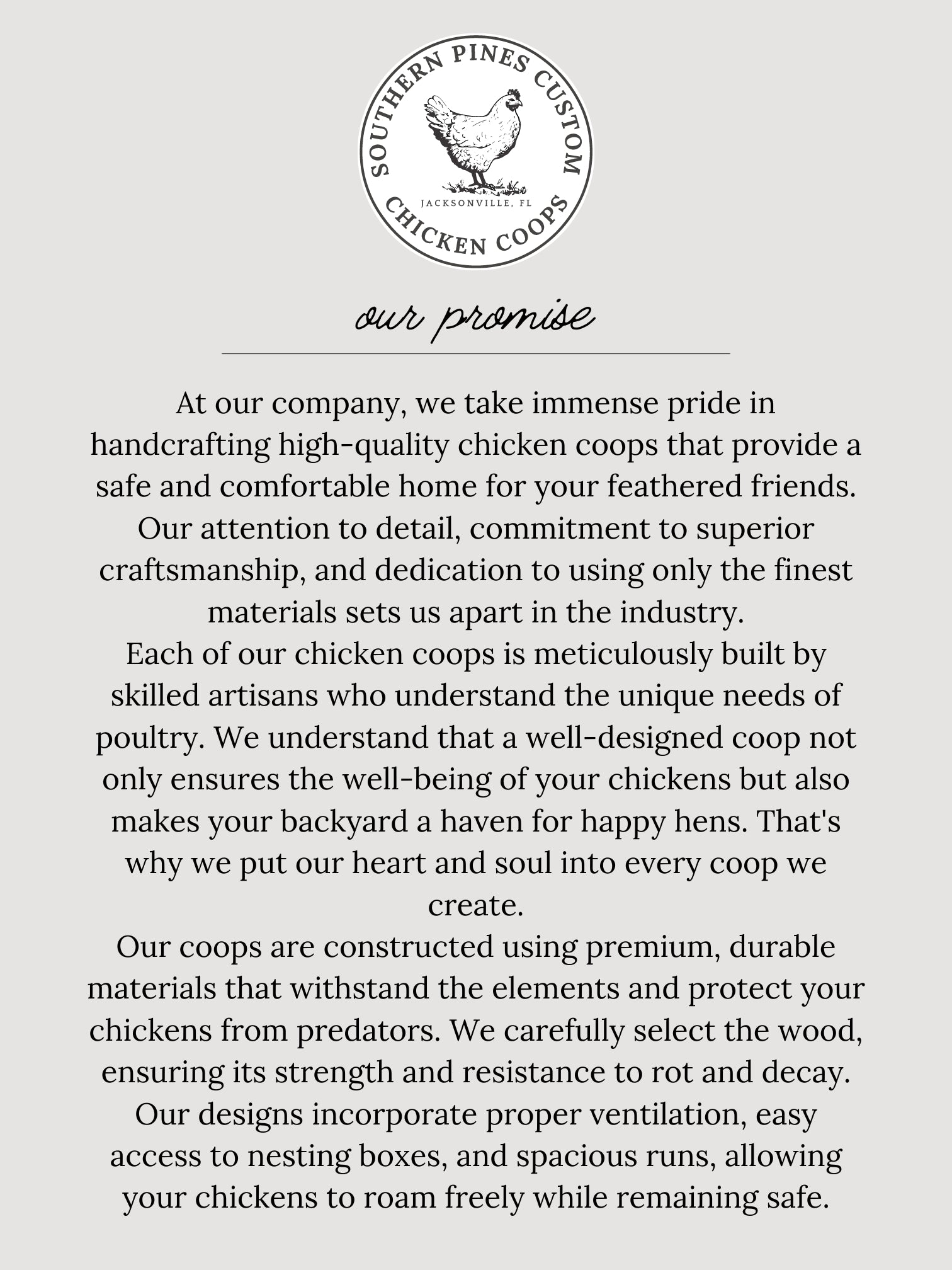 The Jacksonville Coop was made for the residential backyard. In times like these, its always good to be prepared. Having chickens is not only an awesome experience with the proper set up but allows for benefits with daily eggs i.e. pets with benefits ;)